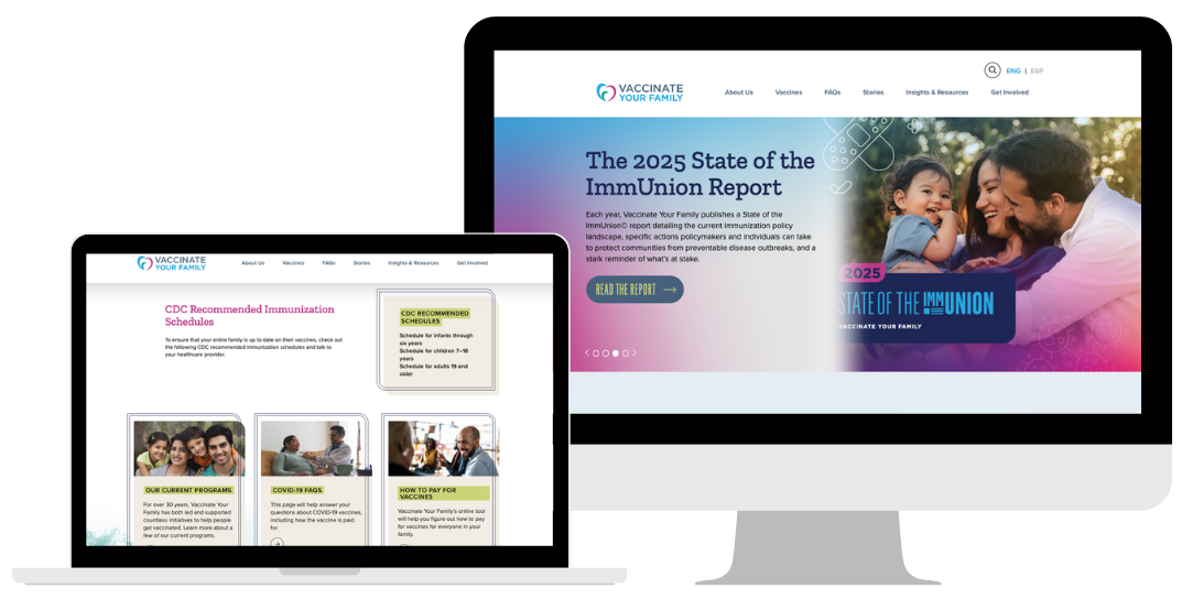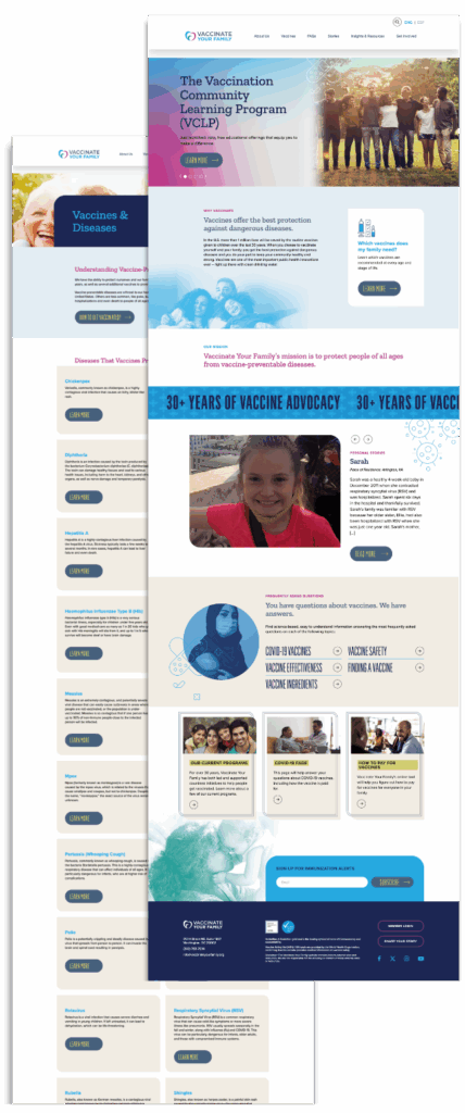 The goal of this project was to create an approachable website that serves Vaccinate Your Family’s crucial mission. We built a digital experience that instantly conveys trust and expertise. In a world of online misinformation, we prioritized straightforward content layout and clear site navigation to ensure people could find the most accurate information available on vaccines to date.