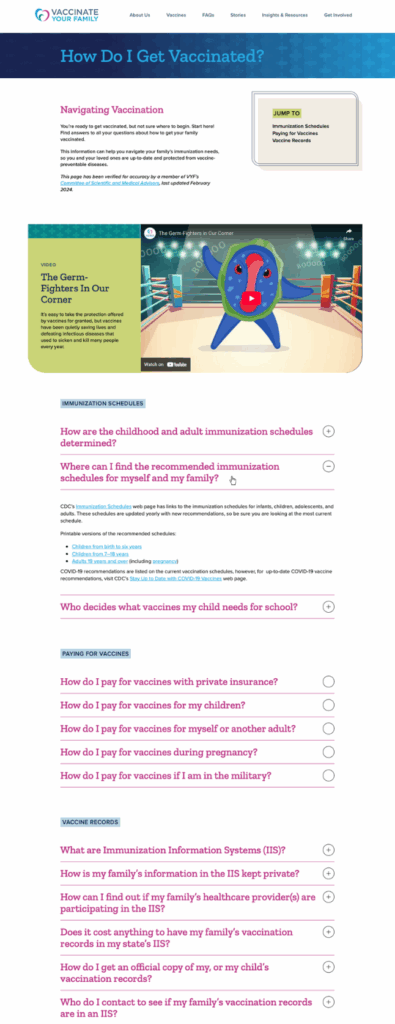 Our work on this website and our continued work with Vaccinate Your Family directly supports the incredible advocacy of their organization. eighty2degrees‘ design and our technical expertise brings VYF’s scientific mission to the forefront. A great example of this is the comprehensive FAQ section. We recommended and implemented an accordion feature that allows visitors to browse many questions and answers without endless scrolling, reinforcing the site’s role as a quick and easy go-to resource.